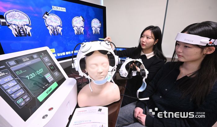 초음파기기로 치매를 치료하는 시대가 열린다. 주말 경기 성남시 분당구 딥슨바이오 연구원이 치매 치료용 초음파 자극 장치 '뉴클레어'를 시연하고 있다. 뉴클레어는 뇌 림프계 노폐물 배출을 촉진하고, 뇌척수액 순환을 촉진하는 의료기기이다.