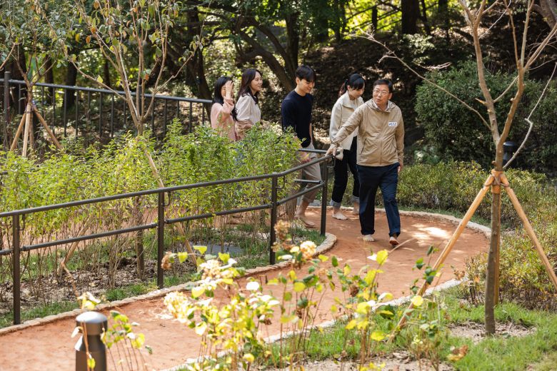 김경호 광진구청장과 구민들이 아차산 어울림 정원 산책로를 따라 걷고 있다. 아차산에는 맨발 산책로와 아차산 여가센터도 있다.