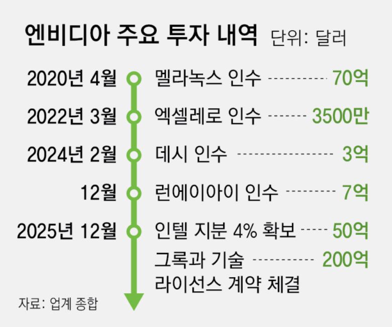 CNBC 등은 엔비디아가 그록의 기술 라이선스와 인력을 확보하기 위해 200억 달러(약 29조 원)를 현금으로 지급했다고 보도했다. 이는 엔비디아 설립 이후 최대 규모의 투자다. 엔비디아는 앞서 2020년 이스라엘 반도체 업체 멜라녹스를 약 70억 달러(약 10조 원)에 인수했고, 최근에는 인텔에 50억 달러(약 7조 원)를 투자해 약 4%의 지분을 확보했다.