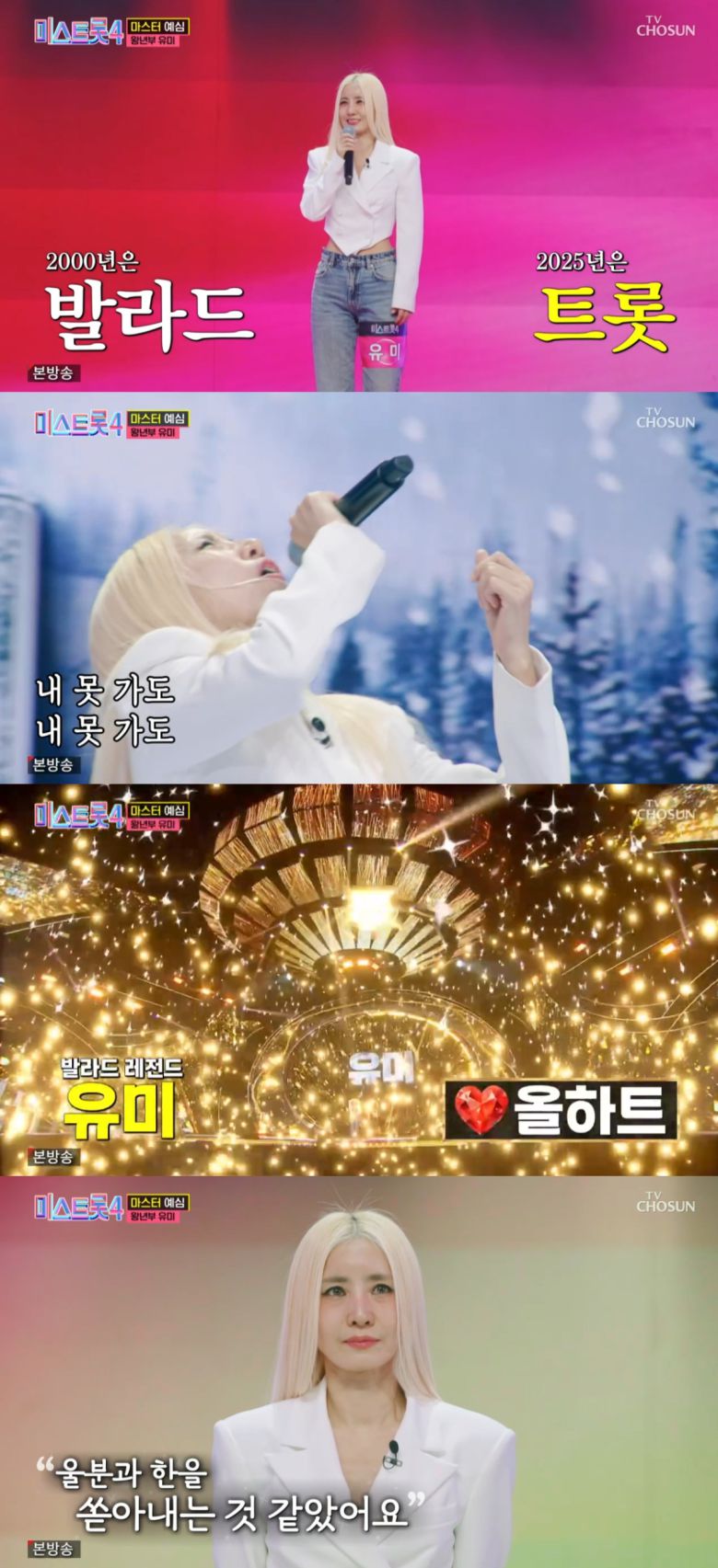 25일 방송된 TV조선 ‘미스트롯4’는 마스터 예심이 진행된 가운데 가수 유미가 왕년부로 출연해 ‘별리’ 무대를 꾸몄다.