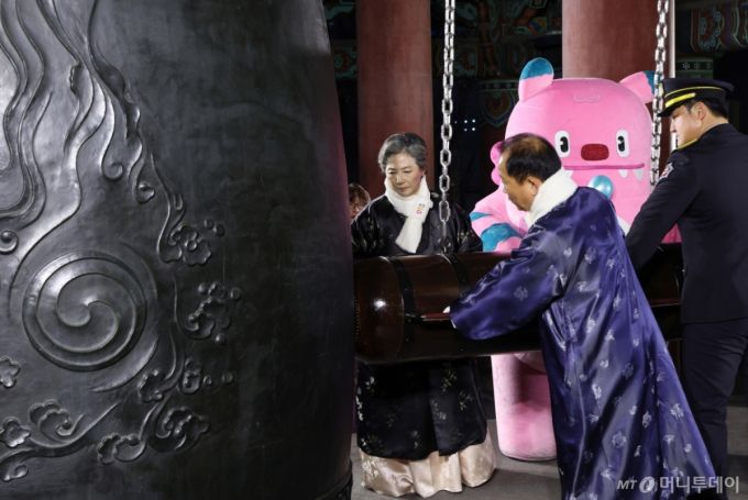 새해 첫날인 1일 오전 서울 종로구 보신각에서 열린 제야의 종 타종행사에서 시민대표들이 타종하고 있다. 이날 타종에는 서울시 문화 분야 명예시장인 배우 고두심 씨, 한국 야구계 대표 지도자 김성근 감독, 39년째 쌀 나누기 봉사를 이어온 신경순 씨, 45년간 700회가 넘는 헌혈을 실천한 이승기 씨 등 시민대표 9명과 서울시 대표 상징물 캐릭터 해치가 참석했다. /사진=뉴스1 |