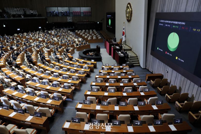 국회 본회의에서 더불어민주당 등 야당 단독으로 노란봉투법(노동조합 및 노동관계조정법 개정안)이 통과되고 있다. 문재원 기자