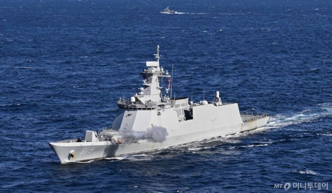 지난 1월3일 남해상에서 해군 제3함대 호위함 경남함이 대함사격을 실시하고 있다. 앞은 경남함, 뒤는 고속정. / 사진=해군 |