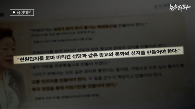 뉴스타파는 한주그룹의 내부 문건을 입수했다. 맨앞엔 '참어머님 말씀', 한학자 총재의 지시 사항이 적혀 있다. “천원단지를 로마 바티칸 성당과 같은 종교와 문화의 성지로 만들어야 한다”.