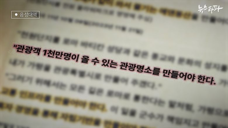 한주그룹의 내부 문건에서는 천원단지, 통일교 타운의 성지화와 관련한 한학자 총재의 지시가 구체적으로 이어진다. 먼저 “관광객 1천만 명이 올 수 있는 관광명소를 만들어야 한다”는 지시다.