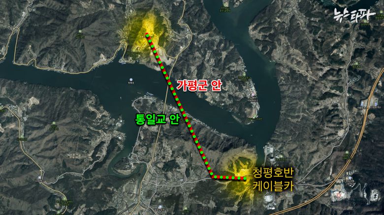 통일교 한주그룹의 케이블카 코스와 가평군의 코스를 지도 위에 표시해봤다. 두 코스가 정확히 일치했다.
