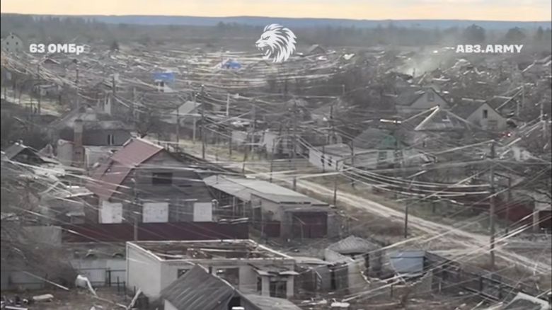 지난 19일 우크라이나군 제63독립기계화여단이 텔레그램을 통해 공개한 영상. 우크라이나 동부 전선에서 러시아·우크라이나군이 보낸 광섬유 드론에서 뿜어져 나온 케이블이 마치 거미줄처럼 온 마을을 덮고 있다. /텔레그램 |