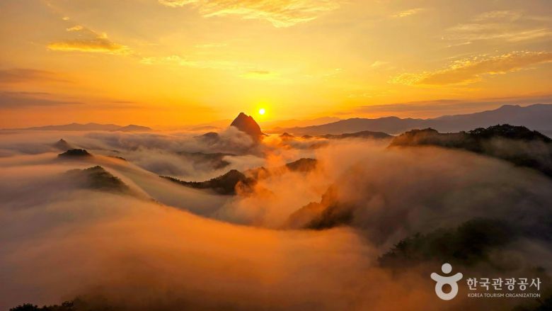 전북 진안 마이산(馬耳山)은 '말의 귀를 닮은 산'이라는 뜻으로 말의 해에 더욱 주목받는 여행지다. 사진은 한국관광공사 '2025 대한민국 관광공모전' 사진 부문 수상작 중 하나인 '마이산 일출과 운해'(이은숙 작). / 한국관광공사