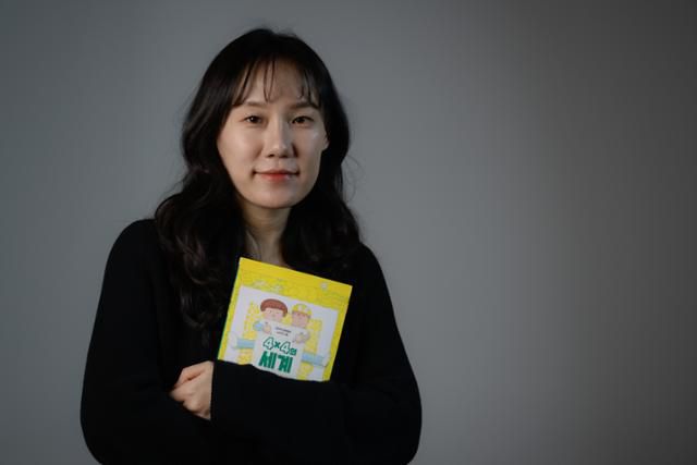 조우리 작가가 22일 서울 중구 한국일보사에서 제66회 한국출판문화상 어린이·청소년 부문 수상작 '4ⅹ4의 세계'를 안고 있다. 하상윤 기자 |