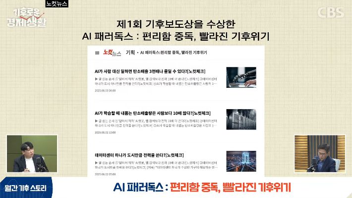 ◇ 강석찬> 박기묵 기자, 최원철 기자, 장윤우 기자, 그리고 저까지 총 4명이서 12건의 연속 기획 팩트 체크 보도를 했고요. 기후위기 관점에서 AI를 짚어보고자 했습니다. 막연히 AI가 기후에 악영향을 끼칠 수 있겠지, 정도의 의문점을 아 그렇구나, 로 바꾸는 과정이었다고 생각하시면 될 것 같습니다.