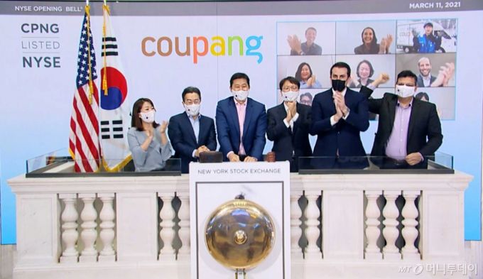 쿠팡 경영진이 2021년 3월11일(현지시간) 뉴욕증권거래소에서 상장기념 '오프닝 벨'을 울리고 있다. 사진 왼쪽부터 김현명 쿠팡 IR 팀장, 강한승 쿠팡 대표이사, 김범석 쿠팡 이사회 의장, 박대준 쿠팡 대표이사, 존 터틀 NYSE 부회장, 거라브 아난드 쿠팡 CFO. /사진제공=쿠팡 |