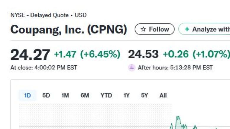 뉴욕증시 쿠팡 주가 6.45% 급등…24.27달러로 마감