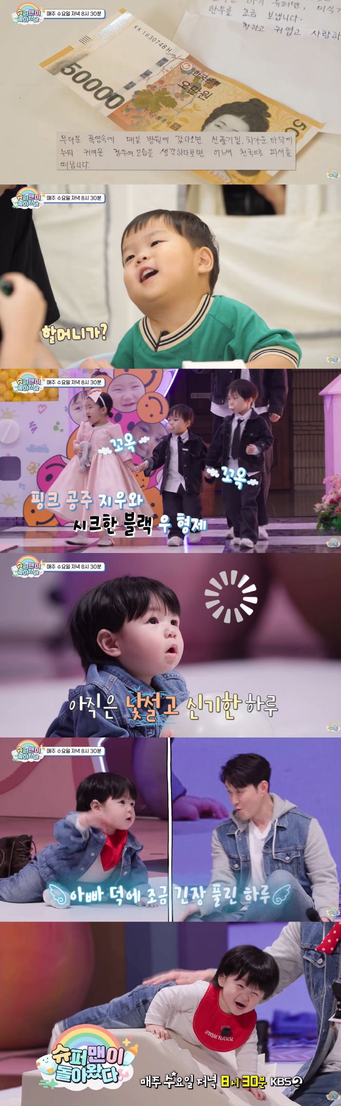 예고편에는 김준호 아들 정우의 열혈 팬인 84세 할머니의 사연이 소개돼 뭉클함을 안겼다. 지난여름 '슈돌' 제작진 앞으로 5만 원권 지폐 한 장과 함께 한 통의 편지가 도착했다. 편지에는 '올해 84세의 독거노인으로 혈액투석을 하고 있고 관절염으로 잘 움직이지 못하는 환자이다', '무더운 폭염 속에 매일 병원에 갔다 오면 선풍기 밑 차가운 바닥에 누워 귀여운 정우의 모습을 생각하다 보면 어느새 천국으로 피서를 떠난다'는 내용이 담겨 있었다. 정우를 향한 진심 어린 애정이 전해져 감동을 자아냈다. 아빠를 통해 사연을 전해 들은 정우는 "할머니가?"라며 해맑은 미소를 지어 사랑스러움을 더했다.