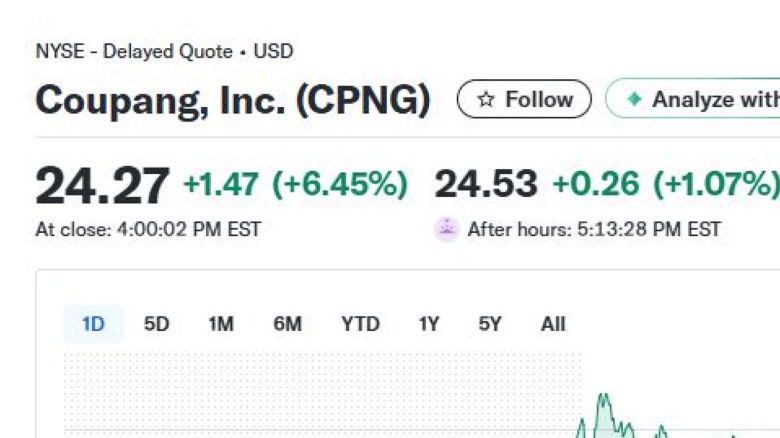 뉴욕증시에서 쿠팡 주가가 6.45% 상승했습니다.