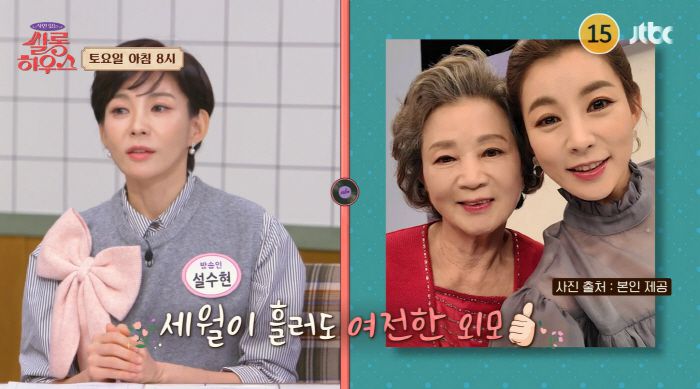 이날 MC 노사현은 설수현을 소개하며 "수현 씨하면 역시 자매 모두가 미스코리아 출신"이라고 말했다. 설수현은 부모님의 젊은 시절 사진부터 최근 사진까지 공개하며 모두를 놀라게 했다.