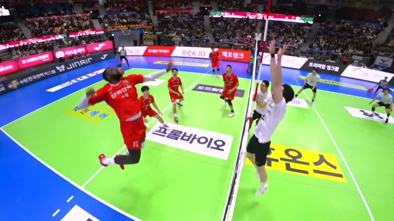 한국전력 베논이 상대 블로커 위에서 잇따라 강타를 꽂아넣습니다.