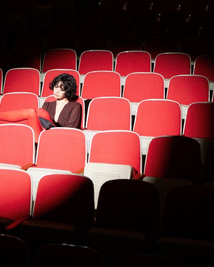 특히 조명이 스치듯 드러난 쇄골과 어깨라인이 스타일의 포인트로 작동하며, 레드 좌석이 깔린 공간과 어우러져 '시네마틱'한 분위기를 완성했다.