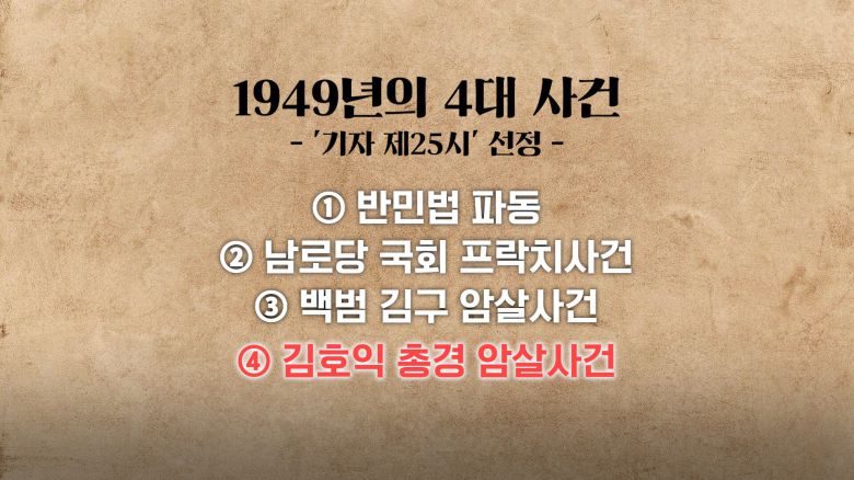 그런데 국회 프락치 사건 발생 두 달이 채 안 된 1949년 8월 12일 오전 11시. 옛 중앙청 앞에 있던 서울시경 사찰과 김호익 중앙분실장 방으로 군복 차림의 남자가 노크를 하고 들어왔습니다. 남자는 내무부 치안국 모 과장의 위조된 명함을 건네며 과장의 소개장을 가지고 찾아왔다고 말합니다. 그러냐며 명함을 받아보는 순간 남자는 가슴에 차고 있던 권총을 꺼내 7발을 연속으로 발사했습니다. 공산당이 없어져야 대한민국이 발전한다는 신념으로 남로당의 집요한 공작을 온몸으로 막아내던 서른한 살 젊은 수사관이 쓰러지고 만 것입니다. 당시 동아일보는 이렇게 보도했습니다. “국회 내 남로당 프락치 사건을 비롯해 박헌영 직계 국제 간첩 사건, 법조계 및 법원 내 세포 사건 등으로 민애청과 남로당 핵심체를 여지없이 분쇄해 공산 계열에 치명적 타격을 주어 삼천만 겨레의 자유와 복지를 위해 찬란한 공적을 쌓아오던 김호익 경감이 피습 절명했다.”