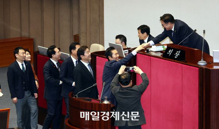정청래 더불어민주당 대표(단상 아래 오른쪽 둘째)가 24일 국회 본회의에서 민주당 의원들과 함께 정보통신망법 개정안에 대한 필리버스터 종결 투표를 마치고 우원식 국회의장과 악수하고 있다. 김재훈 기자