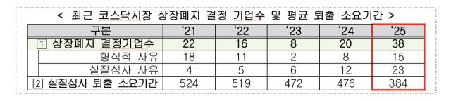26일 한국거래소가 발표한 ‘2025년도 코스닥 시장 IPO·상장폐지 결산 및 향후 계획’에 따르면 올해 코스닥 시장에서 상장폐지된 기업은 총 38개사로 최근 3년(2022~2024년) 평균 대비 약 2.5배 증가했다. 특히 재무 구조 악화, 회계 처리 문제, 내부통제 미흡 등 실질 사유에 따른 상장폐지 결정 기업은 23개사로, 최근 3년 평균의 약 3배에 달했다.