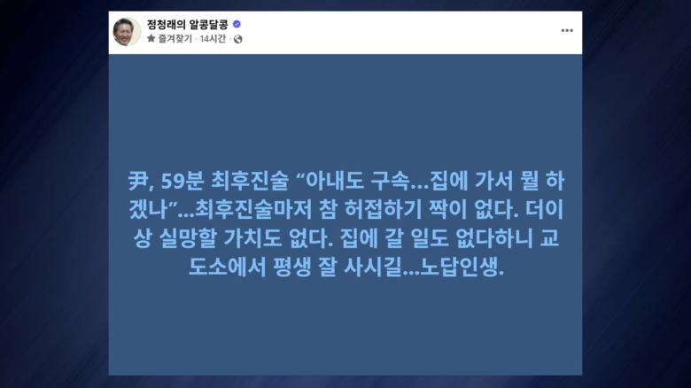 정 대표는 어젯밤(27일) SNS에, '아내도 구속되어 있는데 집에 가서 뭘 하겠느냐'는 윤 전 대통령 발언은 더 실망할 가치도 없다며, '노답인생'이라고 적었습니다.