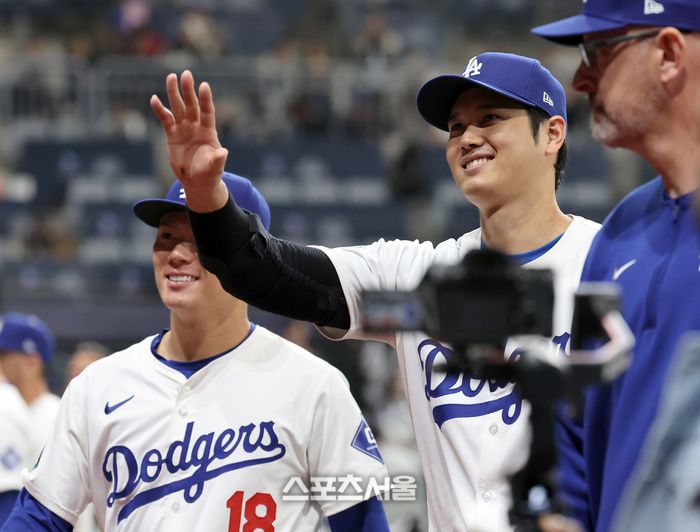 LA 다저스 오타니가 17일 서울 고척스카이돔에서 진행된 키움과 연습경기에 앞서 관중석을 향해 인사를 하고 있다. 사진 | 박진업 기자 upandup@sportsseoul.com |