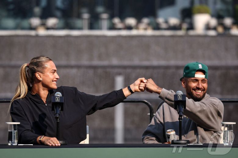 남녀 성대결을 벌일 예정인 아리나 사발렌카와 닉 키리오스(왼쪽)가 28일(한국시간) 열린 사전 기자회견에서 주먹을 맞대고 있다. ⓒ AFP=뉴스1
