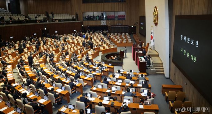 (서울=뉴스1) 이승배 기자 = 9일 서울 여의도 국회에서 열린 제429회국회(정기회) 제16차 본회의에서 나경원 국민의힘 의원이 가맹사업법 개정안에 대한 무제한토론(필리버스터)에 돌입한 가운데 더불어민주당 의원들이 본회의장을 떠나고 있다. 2025.12.9/뉴스1  Copyright (C) 뉴스1. All rights reserved. 무단 전재 및 재배포,  AI학습 이용 금지. /사진=(서울=뉴스1) 이승배 기자
