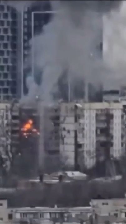 27일(현지시간) 러시아의 공습을 받은 우크라이나 수도 키이우의 한 건물에서 화염이 솟아오르고 있다. AFP=연합뉴스 |