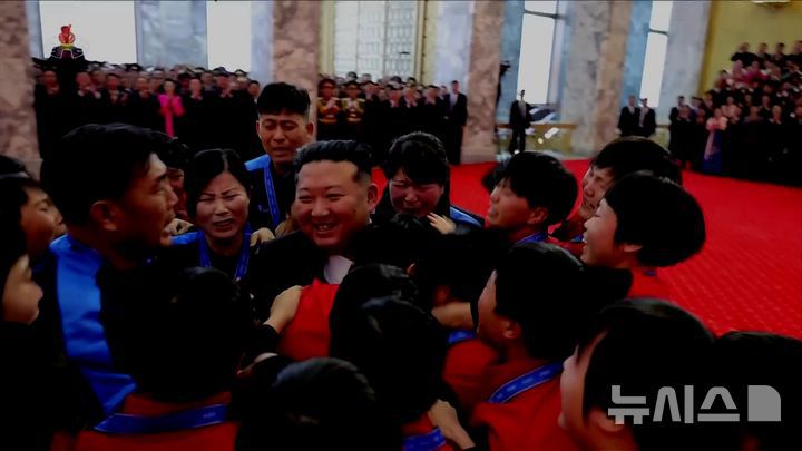 [서울=뉴시스] 김정은 북한 국무위원장이 지난 27일 만수대의사당에서 조선민주주의인민공화국 헌법절 기념 행사에 참석, 국제축구연맹(FIFA) 17세 미만(U-17) 월드컵에서 우승한 여자축구팀 선수들과 감독들을 만나 축하하고 격려했다고 조선중앙TV가 28일 보도했다. (사진=조선중앙TV 캡처) 2025.12.28. photo@newsis.com