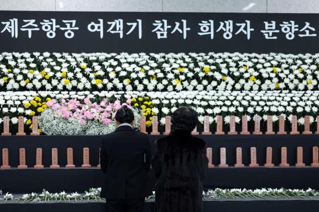 28日,“12·29”济州航空客机空难一周年纪念日的前一天,在位于全罗南道的务安国际机场集体灵堂,大批市民向事故遇难者献花追思。去年12月29日,一架济州航空波音737-800客机在务安国际机场降落时撞墙起火,造成除2人获救外,机上179人全部遇难。