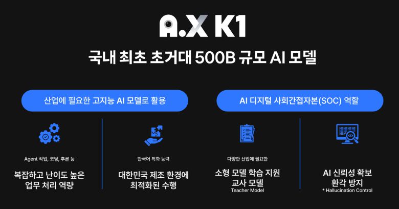 영어를 주로 사용하는 다른 AI 모델과 달리 처음부터 한국어로 학습하도록 설계된 것도 ‘A.X K1’의 특징이다. 이 같은 한국어 특화 능력 덕분에 우리나라의 문화, 경제, 역사를 잘 아는 국민 맞춤형 서비스를 만드는 데 적합하다는 설명이다. SK텔레콤 컨소시엄은 ‘A.X K1’을 국내 AI 생태계의 다양한 기업들에 오픈소스로 개방할 계획이다. 모델 개발에 활용된 학습 데이터의 일부도 공공·민간 플랫폼에 공개할 방침이다.