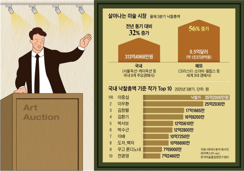 한국 미술품 감정 연구 센터에 따르면, 올해 3분기 서울옥션 등 국내 9개 경매사의 총 낙찰 총액은 약 313억4968만원으로 전년 동기 대비 32% 증가했다. 크리스티·소더비·필립스 등 세계 3대 경매사의 올해 3분기 총 낙찰 총액은 9억5000만달러(약 1조3728억원)로 전년 동기 대비 56% 증가했다. 파이낸셜타임스(FT)는 “올 초부터 지난 12일까지는 전년 동기 대비 15% 증가했다”며 “이는 2022년 이후 처음으로 연간 매출 증가를 기록한 것”이라고 지난 24일 보도했다.