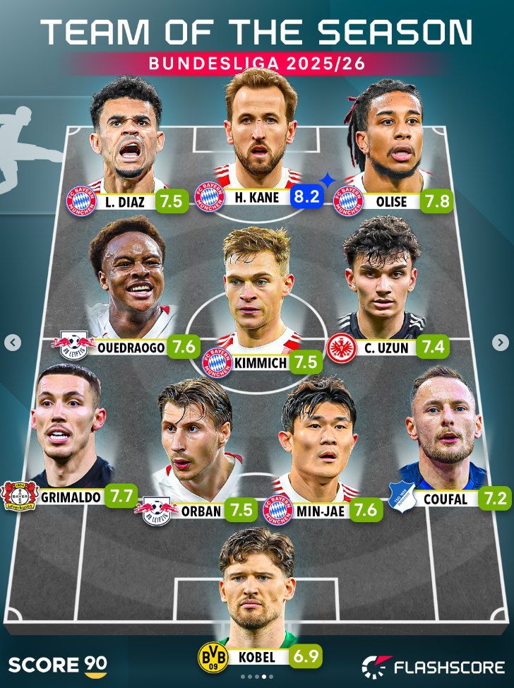 글로벌 축구매체 '스코어90'은 지난 22일(한국시간) 사회관계망서비스(SNS) 계정을 통해 '2025-2026시즌 유럽 5대리그 베스트 11'을 공개했다.