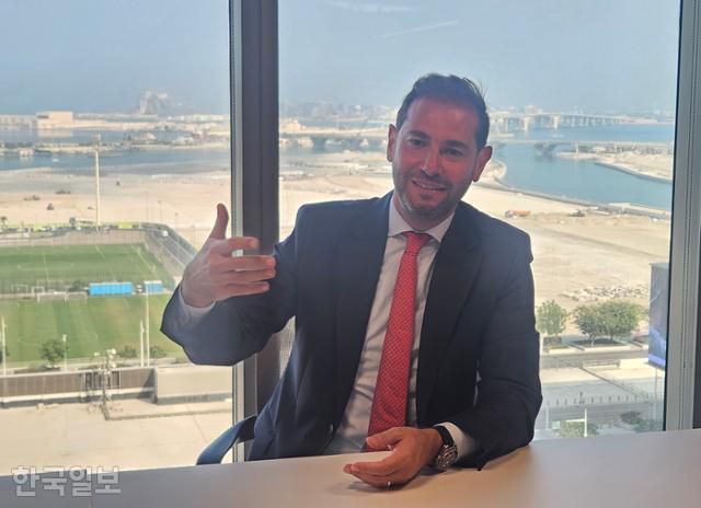 4일(현지시간) 아랍에미리트(UAE) 아부다비 금융자유구역 내 투자진흥청(ADIO)에서 만난 아흐마드 수브라 클러스터기획·개발본부장이 인공지능(AI) 인프라와 기업 투자 유치 전략을 설명하고 있다. 창밖으로 보이는 지역은 주거·상업 복합구역으로 조성될 예정이다. 아부다비=김태연 기자