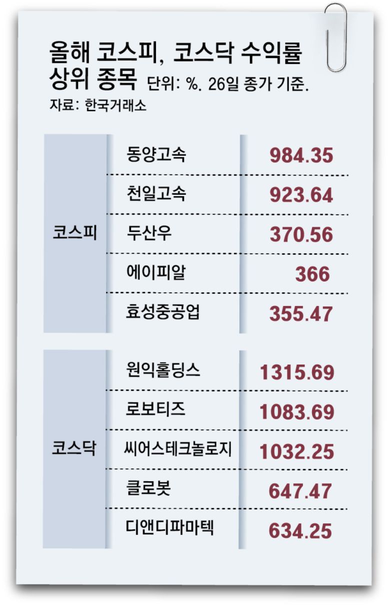 올해 뜨거웠던 코스피에서 가장 크게 상승한 종목은 동양고속(984.35%)과 천일고속(923.64%)으로 집계됐다. 서울시가 추진 중인 서울고속버스터미널 재개발 기대감이 커지면서 9거래일 연속 상한가를 기록하는 등 급등했다. 천일고속과 동양고속은 서울고속버스터미널 지분을 각각 16.67%, 0.17% 보유 중이다. 다만 두 종목 모두 유통 주식 수가 많지 않기 때문에 단기 급등에 따른 거래정지 조치가 끝난 뒤 급락하는 등 큰 변동을 보였다.