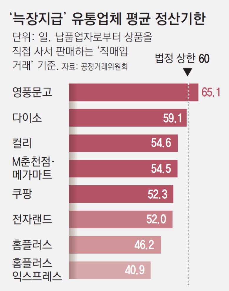 현행 대규모유통업법은 납품업체로부터 상품을 직접 매입해 판매하는 직매입 거래의 경우 상품수령일로부터 60일 이내 대금을 지급하도록 규정하고 있다. 해당 유통기업들은 사실상 법정 기한을 모두 채우고 있는 셈이다.