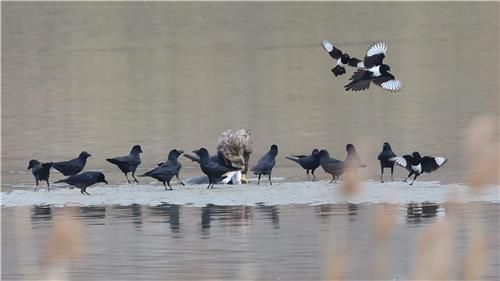 하루 1∼2차례 주로 물고기를 사냥하는 산만 한 덩치의 흰꼬리수리가 모래톱에 연어를 잡아 와 먹으려고 하는 찰라 어떻게 알고 왔는지 까마귀와 까치가 날아와 꼬리를 잡아당기거나 날개를 툭툭 치는 등 양아치 짓으로 집단 괴롭힘을 가한다.