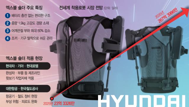 현대자동차그룹의 착용 로봇 ‘엑스블 숄더’가 글로벌 무대에서 데뷔전을 치르며 해외 공략 신호탄을 쐈다. 현대차(005380)그룹의 착용 로봇은 올 들어 국내 산업 현장에 투입돼 성능 검증을 마쳤다. 내년부터는 북미·유럽으로 판로를 확대해 성장 잠재력을 갖춘 착용 로봇 시장을 선점한다는 구상이다.