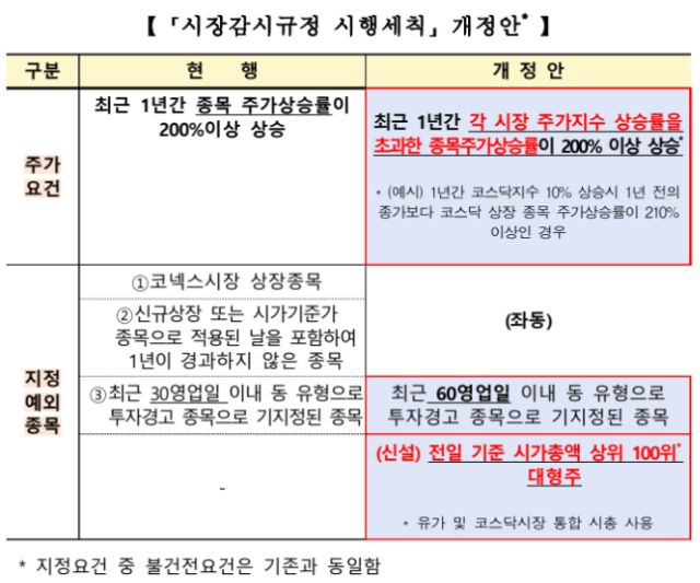 불공정거래 개연성이 상대적으로 낮은 대형주가 초장기상승·불건전요건 유형으로 투자경고종목에 포함되는 사례가 발생하자 기준을 정교하게 조정하겠다는 취지다.