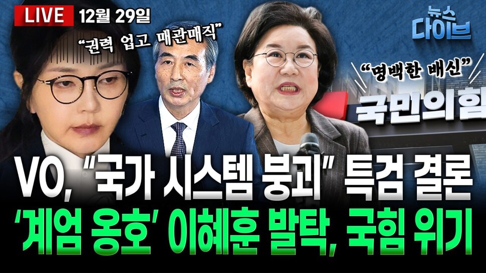 이혜훈 발탁에 정치권 ‘발칵’…민주 ‘당혹’ 국힘 “제명” / 논란 끊이지 않는 김병기…‘사퇴 압박’, 전망은? / ‘한동훈 연대설’에 장동혁…“의미 없다” / 김건희 특검 종료…‘뇌물 아닌 알선수재’ 혐의 의미는 / 쿠팡 김범석 한달 만에 사과…‘이중 플레이’. 오늘(12월 29일) 뷰리핑 많은 시청바랍니다.