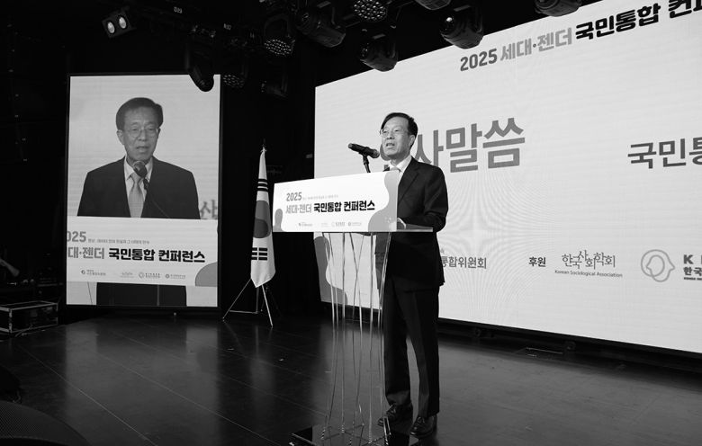 이석연 국민통합위원장이 17일 서울 마포구 구름아래소극장에서 열린 2025 세대·젠더 국민통합 콘퍼런스에서 인사말을 하고 있다. 국민통합위원회 제공