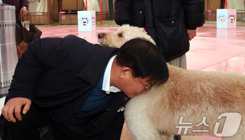 박강수 마포구청장이 23일 서울 마포구 마포반려동물캠핑장에서 열린 댕댕이 크리스마스 페스타 주간 펫세권 마포 홍보견 '바오' 데뷔 데이 행사에서 '바오'와 교감하고 있다.. 2025.12.23/뉴스1 ⓒ News1 김명섭 기자 |
