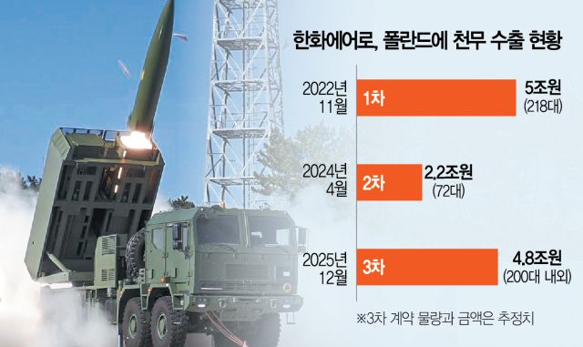 폴란드는 앞서 2022년과 2024년 두 차례에 걸쳐 천무 발사 체계(발사대+유도탄)를 대규모로 도입했다. 2022년 11월에 이뤄진 폴란드와 한화에어로스페이스 간 1차 이행 계약은 5조 357억 원(천무 218대 포함)이고 2024년 4월 2차 계약은 2조 2000억 원(천무 72대 포함)이다. 이번 계약으로 폴란드와 3차례에 걸친 총 계약 규모는 약 12조 원을 넘어설 것으로 전망된다. 업계 관계자는 “러시아와 우크라이나 간 전쟁이 장기화되고 최근에는 러시아가 유럽까지 군사적 도발 위협 수위를 높이면서 폴란드 정부가 군비 확대에 나서고 있다”며 “그 연장선에서 폴란드 정부가 충분한 지상군 무기를 확보하고자 유도탄 위주로 추가 계약에 나선 것으로 안다”고 말했다.