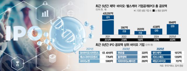 29일 서울경제신문이 최근 5년간 IPO 한 제약·바이오 기업의 공모자금 조달 규모를 분석한 결과 올해 공모액은 총 9948억 원으로 집계돼 코로나19 수혜로 역대 최고치를 기록했던 2021년(4조 2297억 원) 이후 4년 만에 가장 높은 수준을 기록했다.