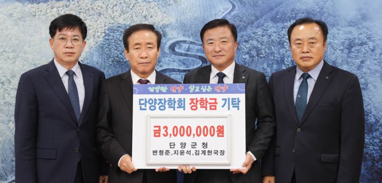 29일 퇴임한 변형준(왼쪽), 지윤석(오른쪽 두번째), 김계현 국장(오른쪽)이 김문근 군수에게 장학금을 전달하고 있다. 사진=단양군제공 |