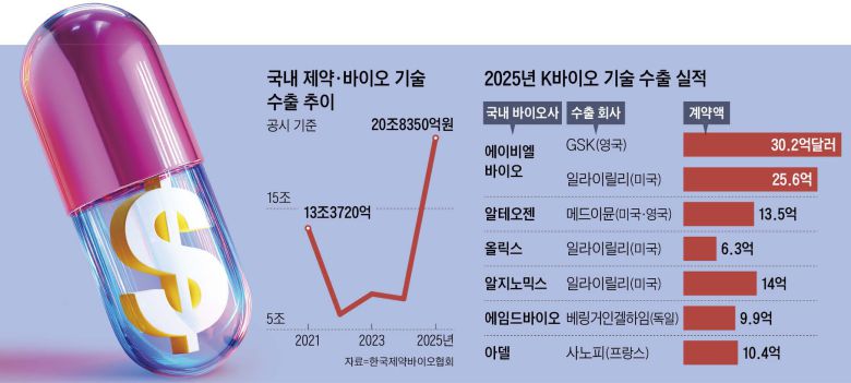 한국제약바이오협회는 올해 1~12월 국내 제약 바이오 기업의 누적 기술 수출액이 145억3000만달러(약 20조8350억원·비공개 계약 제외)로 집계됐다고 지난 28일 밝혔다. 이로써 종전 최대 실적이었던 2021년 13조3720억원을 큰 폭으로 뛰어넘었다.
