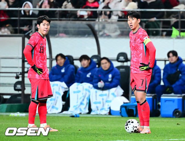 [OSEN=서울월드컵경기장, 지형준 기자] 홍명보 감독이 이끄는 한국 축구대표팀이 18일 오후 8시 서울월드컵경기장에서 열린11월 A매치 두 번째 친선경기에서'아프리카 강호' 가나를 상대로 1-0 승리했다.내달 2026 국제축구연맹(FIFA) 북중미 월드컵 조 추첨을 앞두고 열리는 마지막 평가전이었다.한국은 가나까지 잡아내면서 사상 최초로월드컵 포트 2를 확정하게 됐다. 이로써 대표팀은 홍명보 감독이 부임한 뒤 처음으로 A매치 2연전에서 나란히 승리를 거두게 됐다.후반 대한민국 이강인, 손흥민이 프리킥을 준비하고 있다. 2025.11.18 /jpnews@osen.co.kr
