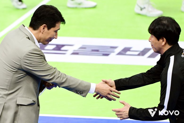 권영민 한국전력 감독(왼쪽)과 신영철 OK저출은행 감독이 경기 전 악수를 나누고 있다. 사진=KOVO 제공 |
