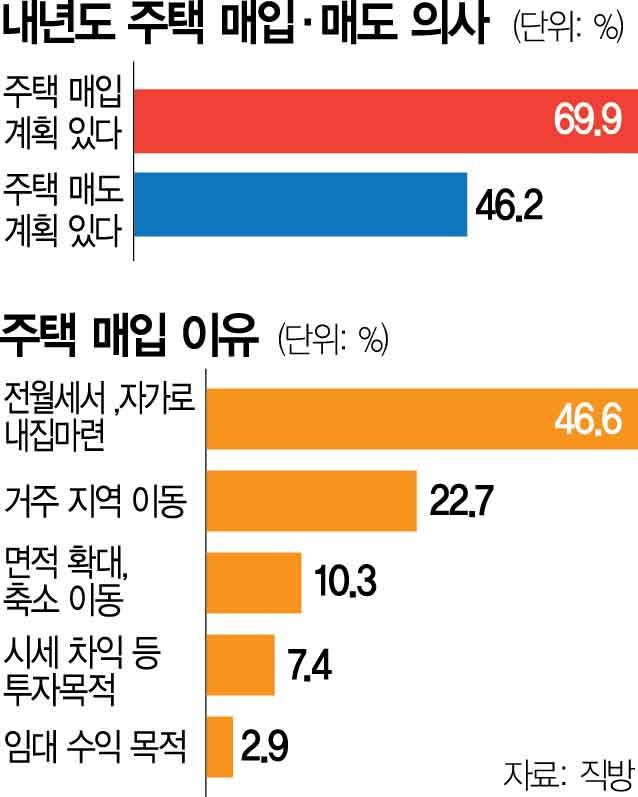 내년에 집을 사겠다는 응답이 10명 중 7명에 달하는 반면 기존 집을 팔겠다는 응답은 절반에 못 미치는 것으로 조사됐다.